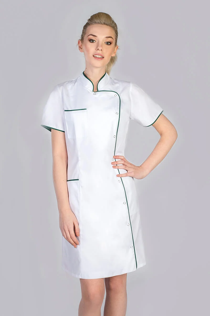 Fartuch medyczny i kosmetyczny W94 to połączenie stylu i praktyczności, idealne dla profesjonalistów w branży medycznej i kosmetycznej. Charakteryzuje się stójką oraz zapięciem na napy, co zapewnia zarówno elegancki wygląd, jak i wygodę użytkowania.. Z kolei wyposażenie produktu w kieszenie umożliwiają przechowywanie niezbędnych akcesoriów, co zwiększa funkcjonalność odzieży.